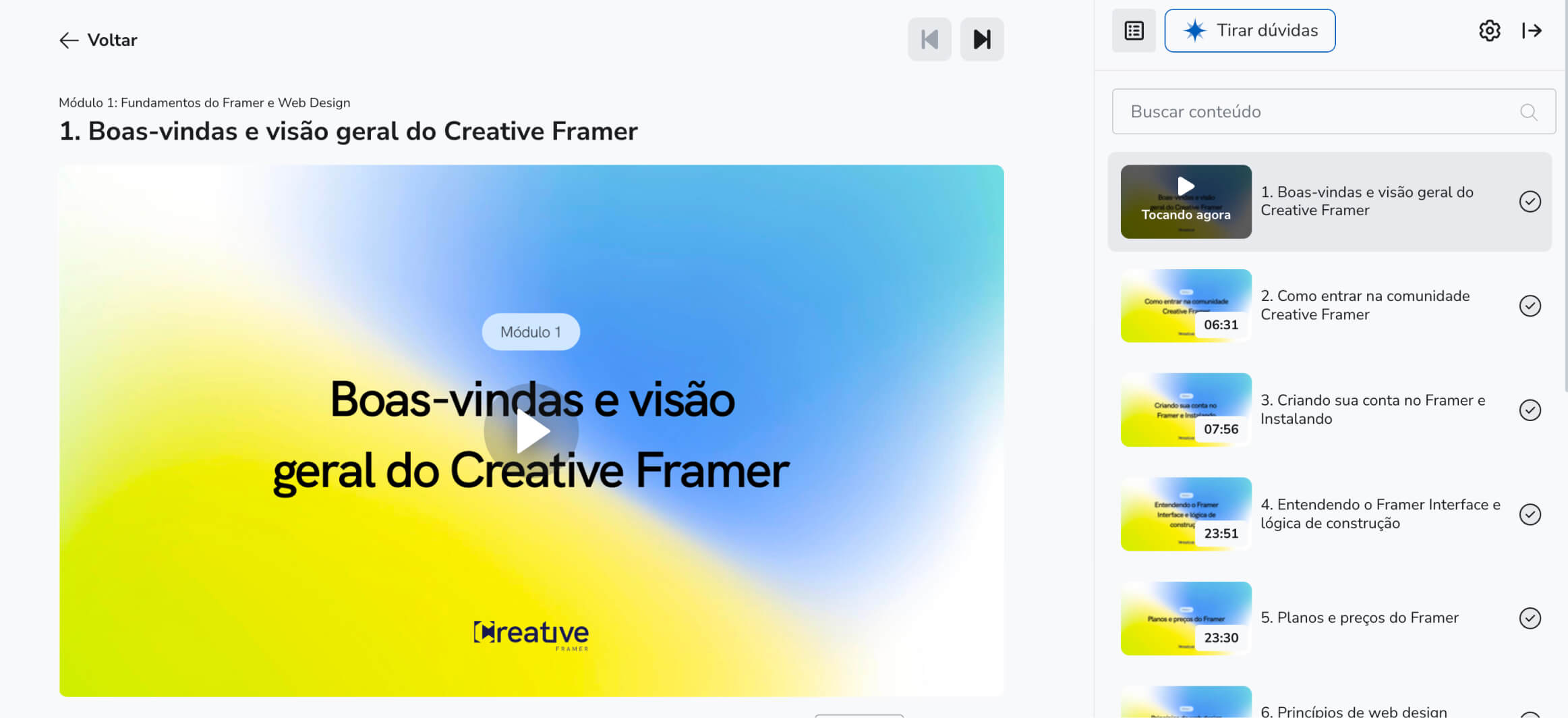 Moldei todos os conteúdos do Creative não no intuito de te entregar os "hacks" do Framer ou templates e soluções prontas, mas sim no intuito de te ensinar a utilizar a ferramenta do zero, resolver problemas e criar suas próprias soluções ao longo da sua jornada profissional.